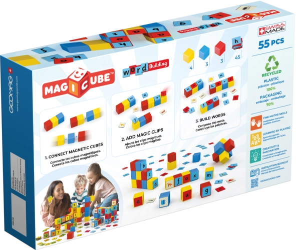Magicube Word Building obsahuje 10 magnetických kostiček a 45 magnetických klipů s obrázky a písmeny. Stavebnice pomáhá při rozvoji kreativity, jemné motoriky a pomocí hry s obrázky stimuluje zvědavost, hledání řešení a zkoumání systému magnetismu.