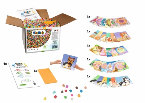Balení obsahuje 16 litrů dílků PlayMais Mosaic, Etikety, 1 brožuru s instrukcemi, 30 kartiček s předlohami (Mandala, Pejsci, Duha, Baleríny a Koníčci) a 6 ks hadříků na vlhčení.