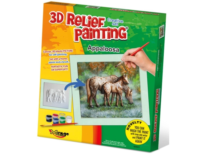 3D obrázek - plastový reliéfní obrázek. Sada obsahuje plastový obrázek 15x17 cm, papírový rámeček 19x21cm , akrylové barvy (6 ks) štětec.