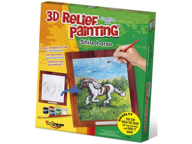 3D obrázek - plastový reliéfní obrázek. Sada obsahuje plastový obrázek 15x17 cm, papírový rámeček 19x21cm , akrylové barvy (6 ks) štětec.