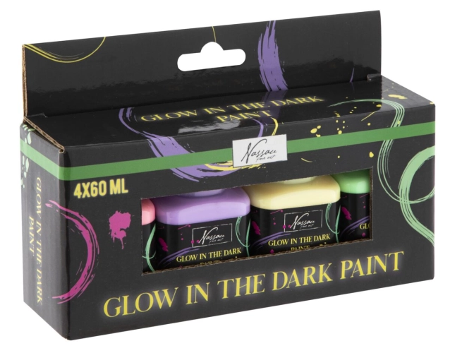 Obsahuje: Akrylové barvy 4 x 60 ml svítící ve tmě. Vhodné pro malování na papír, dřevo, sklo, keramiku, textil, kámen, modelovací hmotu, malířské plátno, malování na kameny apod. Pro získání více barevných odstínů můžete barvy vzájemně míchat. Dají se ředit vodou.
