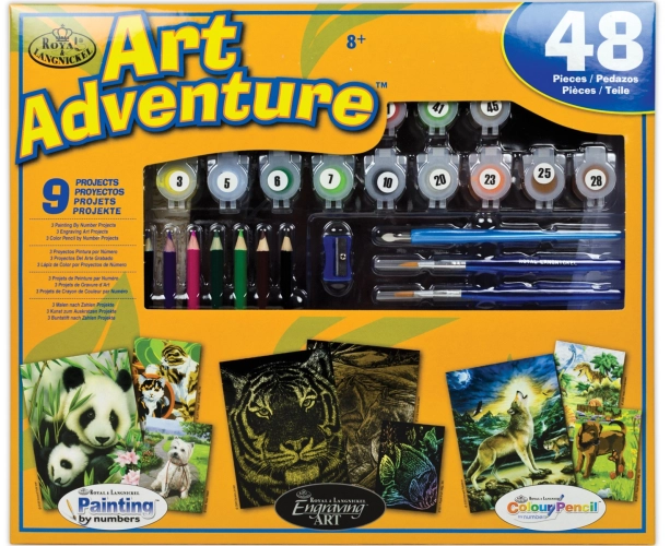 Začněte své umělecké dobrodružství® s touto sadou 7 projektů nejoblíbenějších produktů Royal & Langnickel. Každá sada obsahuje návrhy gravírování Art™ o rozměrech 12,7 x 17,8 cm a 20,3 cm x 25,4 cm, malování podle čísel™ (Painting by Numbers™), barevné tužky podle čísel™ (Color Pencil by Numbers™) a bonusové škrabací obrázky. Tato kompletní sada je ideální pro všechny, kdo chtějí rozvíjet své kreativní dovednosti a užít si zábavu při tvorbě uměleckých děl krok za krokem.