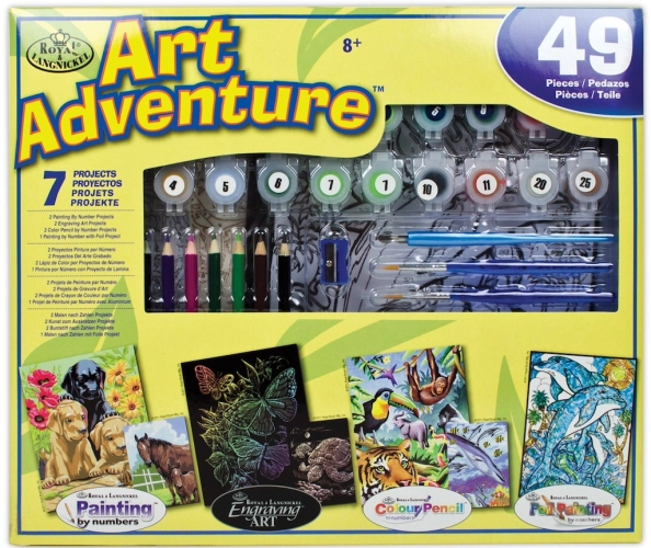 Začněte své umělecké dobrodružství® s touto sadou 7 projektů nejoblíbenějších produktů Royal & Langnickel. Každá sada obsahuje návrhy gravírování Art™ o rozměrech 12,7 x 17,8 cm a 20,3 cm x 25,4 cm, malování podle čísel™ (Painting by Numbers™), barevné tužky podle čísel™ (Color Pencil by Numbers™) a bonusové škrabací obrázky. Tato kompletní sada je ideální pro všechny, kdo chtějí rozvíjet své kreativní dovednosti a užít si zábavu při tvorbě uměleckých děl krok za krokem.