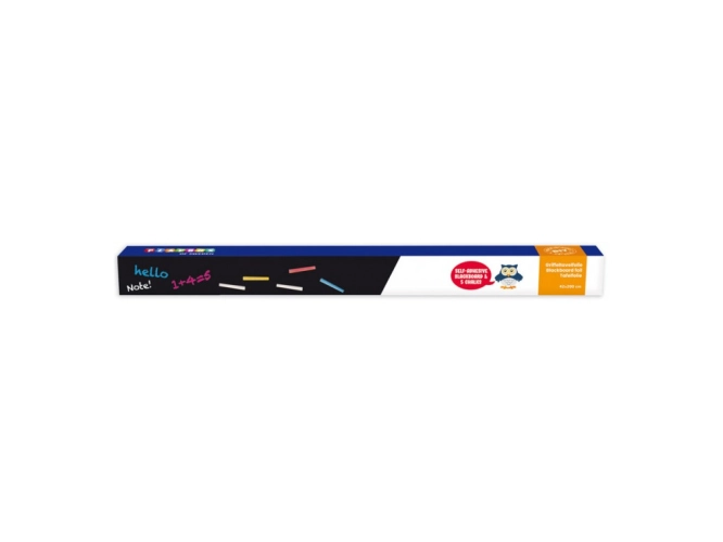 Černá tabulová folie samolepící o velikost 45 cm x 2 m. Balení obsahuje folii a 5 různě barevných kříd (2x bílá, červená, modrá a žlutá).