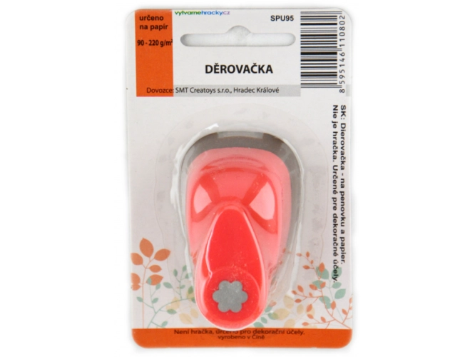 Děrovačka pro výtvarnou tvorbu. Postup: 1. pracujte s děrovačkou na pevné a rovné ploše. 2. vložte papír vhodné tloušťky - 90-220 g/m2 a zatlačte na páku statickým tlakem. Nikdy ne úderem na páku. 3. POUŽÍVEJTE POUZE NA PAPÍR. Děrovačky nikdy nepoužívejte na materiály potažené lepící vrstvou (například na samolepicí štítky), na pěnovku, na papírové ubrousky. Děrovačky nejsou vhodné pro děti do 3let.