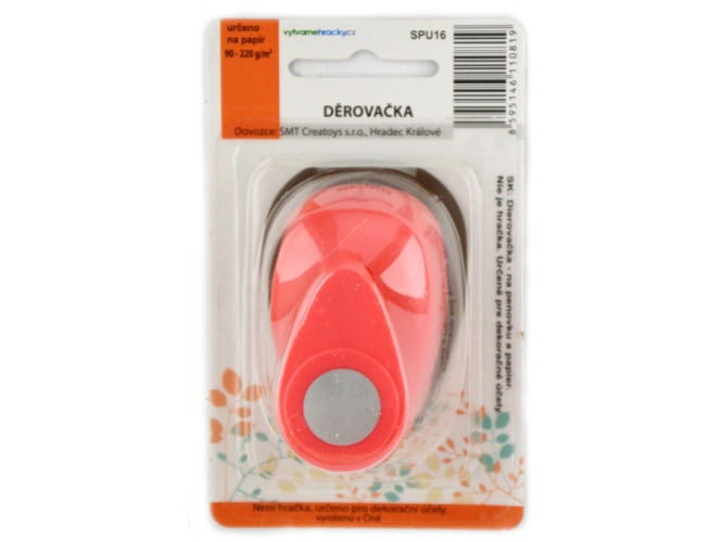 Děrovačka pro výtvarnou tvorbu. Postup: 1. pracujte s děrovačkou na pevné a rovné ploše. 2. vložte papír vhodné tloušťky - 90-220 g/m2 a zatlačte na páku statickým tlakem. Nikdy ne úderem na páku. 3. POUŽÍVEJTE POUZE NA PAPÍR. Děrovačky nikdy nepoužívejte na materiály potažené lepící vrstvou (například na samolepicí štítky), na pěnovku, na papírové ubrousky. Děrovačky nejsou vhodné pro děti do 3let.