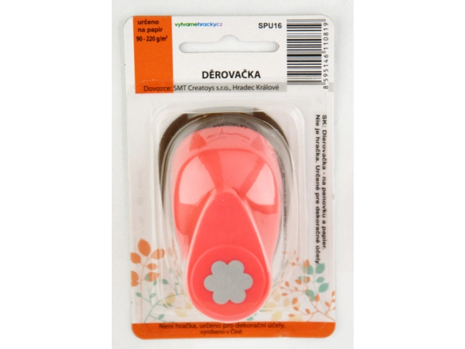 Děrovačka pro výtvarnou tvorbu. Postup: 1. pracujte s děrovačkou na pevné a rovné ploše. 2. vložte papír vhodné tloušťky - 90-220 g/m2 a zatlačte na páku statickým tlakem. Nikdy ne úderem na páku. 3. po proděravění opatrně vytáhněte zbylý papír. 4. POUŽÍVEJTE POUZE NA PAPÍR. Děrovačky nikdy nepoužívejte na materiály potažené lepící vrstvou (například na samolepicí štítky), na pěnovku, na papírové ubrousky. Děrovačky nejsou vhodné pro děti do 3let.