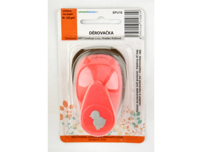 Děrovačka pro výtvarnou tvorbu. Postup: 1. pracujte s děrovačkou na pevné a rovné ploše. 2. vložte papír vhodné tloušťky - 90-220 g/m2 a zatlačte na páku statickým tlakem. Nikdy ne úderem na páku. 3. POUŽÍVEJTE POUZE NA PAPÍR. Děrovačky nikdy nepoužívejte na materiály potažené lepící vrstvou (například na samolepicí štítky), na pěnovku, na papírové ubrousky. Děrovačky nejsou vhodné pro děti do 3let.