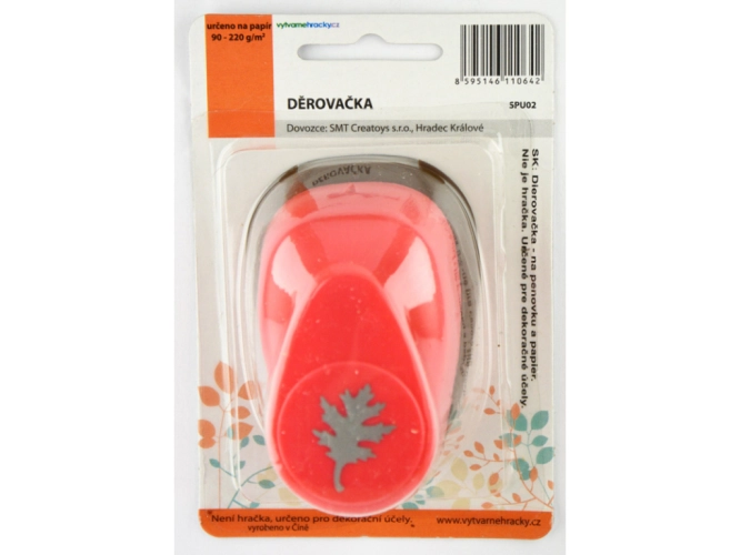 Děrovačka pro výtvarnou tvorbu. Postup: 1. pracujte s děrovačkou na pevné a rovné ploše. 2. vložte papír vhodné tloušťky - 90-220 g/m2 a zatlačte na páku statickým tlakem. Nikdy ne úderem na páku. 3. POUŽÍVEJTE POUZE NA PAPÍR. Děrovačky nikdy nepoužívejte na materiály potažené lepící vrstvou (například na samolepicí štítky), na pěnovku, na papírové ubrousky. Děrovačky nejsou vhodné pro děti do 3let.