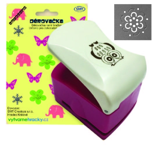 Děrovačka pro výtvarnou tvorbu. Velikost výseku 32 mm. Postup: 1. pracujte s děrovačkou na pevné a rovné ploše. 2. vložte papír vhodné tloušťky - 160-240 g/m2 a zatlačte na páku statickým tlakem. Nikdy ne úderem na páku. 3. po proděravění opatrně vytáhněte zbylý papír. 4. POUŽÍVEJTE POUZE NA PAPÍR. Děrovačky nikdy nepoužívejte na materiály potažené lepící vrstvou (například na samolepicí štítky), na pěnovku, na papírové ubrousky. 5. raznici lze ostřit slabou hliníkovou folii a mazat voskovým papírem. 6. DOPORUČUJEME DĚROVAČKU VYČISTIT PO 3. POUŽITÍCH - odklopte páku raznice, vyjměte kolečko pod pákou a úzkým předmětem odstraňte přebytečné papírky. Děrovačka není hračka.