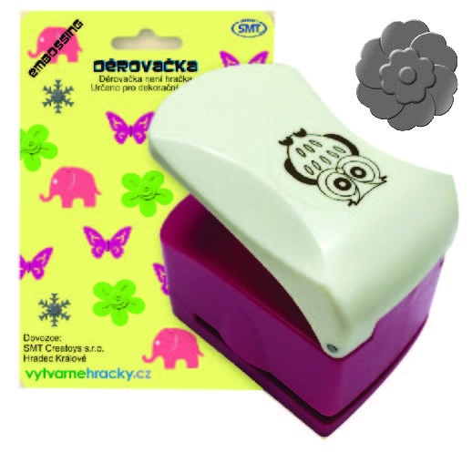 Děrovačka pro výtvarnou tvorbu. Velikost výseku 32 mm. Postup: 1. pracujte s děrovačkou na pevné a rovné ploše. 2. vložte papír vhodné tloušťky - 160-240 g/m2 a zatlačte na páku statickým tlakem. Nikdy ne úderem na páku. 3. po proděravění opatrně vytáhněte zbylý papír. 4. POUŽÍVEJTE POUZE NA PAPÍR. Děrovačky nikdy nepoužívejte na materiály potažené lepící vrstvou (například na samolepicí štítky), na pěnovku, na papírové ubrousky. 5. raznici lze ostřit slabou hliníkovou folii a mazat voskovým papírem. Děrovačka není hračka.