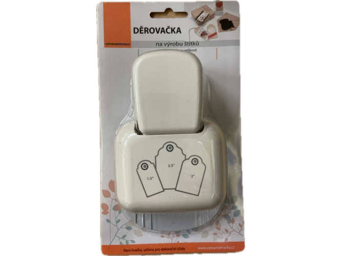 Děrovačka na výrobu třech různých štítků. Velikost štítků je 3,8 cm, 5,1 cm nebo 6,3 cm. Postup: 1. pracujte s děrovačkou na pevné a rovné ploše. 2. nejprve si ořízněte papír na požadovanou šířku štítku (3,8 cm, 5,1 cm nebo 6,3 cm). 3. poté ořízněte papír na požadovanou délku. 4. vložte papír do děrovačky šířkou (podle vybrané velikosti štítku) a vytlačte ozdobný konec. Použijte papír o tloušťce 180 - 250 g/m2. Děrovačky nejsou určené na materiály potažené lepící vrstvou (například na samolepicí štítky), na pěnovku, na papírové ubrousky. Děrovačky nejsou vhodné pro děti do 3 let.