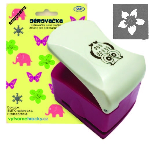 Děrovačka pro výtvarnou tvorbu. Velikost výseku 32 mm. Postup: 1. pracujte s děrovačkou na pevné a rovné ploše. 2. vložte papír vhodné tloušťky - 160-240 g/m2 a zatlačte na páku statickým tlakem. Nikdy ne úderem na páku. 3. po proděravění opatrně vytáhněte zbylý papír. 4. POUŽÍVEJTE POUZE NA PAPÍR. Děrovačky nikdy nepoužívejte na materiály potažené lepící vrstvou (například na samolepicí štítky), na pěnovku, na papírové ubrousky. 5. raznici lze ostřit slabou hliníkovou folii a mazat voskovým papírem. 6. DOPORUČUJEME DĚROVAČKU VYČISTIT PO 3. POUŽITÍCH - odklopte páku raznice, vyjměte kolečko pod pákou a úzkým předmětem odstraňte přebytečné papírky. Děrovačka není hračka.