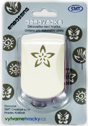 Děrovačka pro výtvarnou tvorbu. Velikost výseku 28 mm. Postup: 1. pracujte s děrovačkou na pevné a rovné ploše. 2. vložte papír vhodné tloušťky - 160-240 g/m2 a zatlačte na páku statickým tlakem. Nikdy ne úderem na páku. 3. po proděravění opatrně vytáhněte zbylý papír. 4. POUŽÍVEJTE POUZE NA PAPÍR. Děrovačky nikdy nepoužívejte na materiály potažené lepící vrstvou (například na samolepicí štítky), na pěnovku, na papírové ubrousky. 5. raznici lze ostřit slabou hliníkovou folii a mazat voskovým papírem. Děrovačky nejsou vhodné pro děti do 3let.