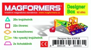 Magformers Designer Box je obsahově i cenově totožný s klasickým balením MAGFORMERS Designer. Všechny dílky uloženy v praktickém plastovém boxu. Designer box obsahuje 62 dílků: 22 čtverců, 20 trojúhelníků, 2 lichoběžníky, 14 vysokých trojúhelníků a 4 kosočtverce