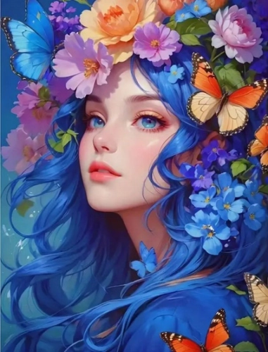 Diamantový obrázek - Žena s květinami a motýly ve vlasech 30x40 cm