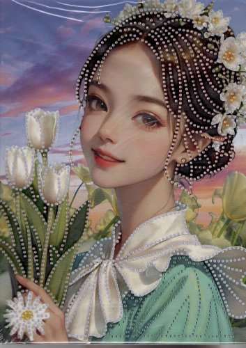 Diamantový obrázek na plátně 23 x 30 cm - Dívka s mašlí a květy ve vlasech
