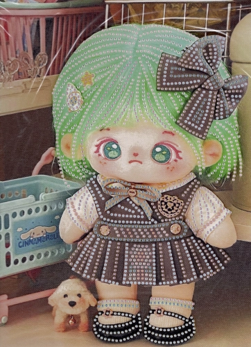 Diamantový obrázek na plátně 23 x 30 cm - Hadrová zamračená panenka, zelené vlasy