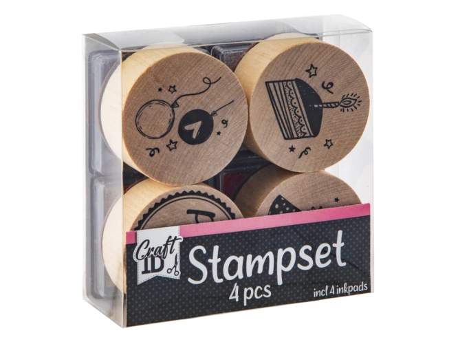 Sada obsahuje 4 ks různých razítek a 4 barevné podušky (černá, stříbrná, zlatá, červená). Velikost razítka 4 cm, velikost balení 8,5 x 8,5 x 3,5 cm.