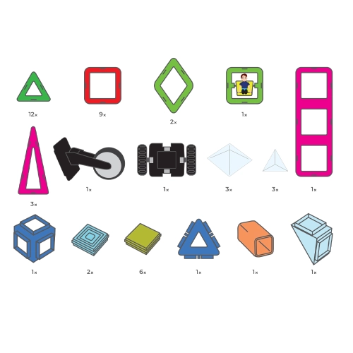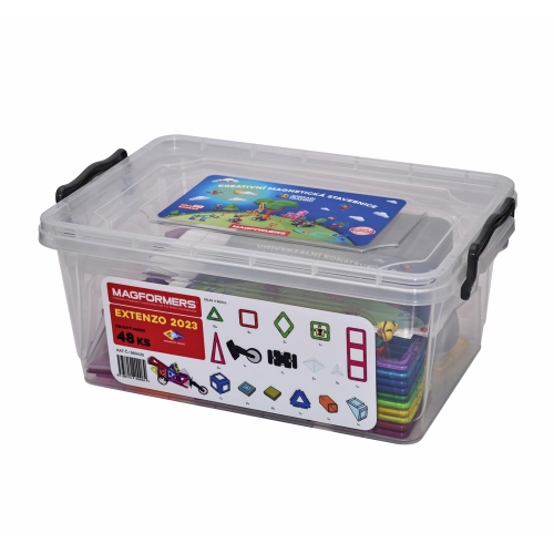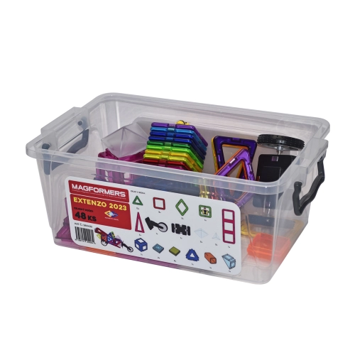 Magformers Extenzo box obsahuje celkem 48 dílků: 9 čtverců, 12 trojúhelníků, 2 kosočtverce, 3 vysoké trojúhelníky, 1 trojitý obdélník, 1 figurku, 1 kolečko, 1 Moto kolečko, 3 Lux pyramidy, 3 Lux pyramidy trojboké, 1 nástavec krychle, 1 nástavec trojboký, 6 nástavcové spojky, 2 spojky pro sloupek, 1 nástavcový sloupek a 1x pravoúhlou spojku