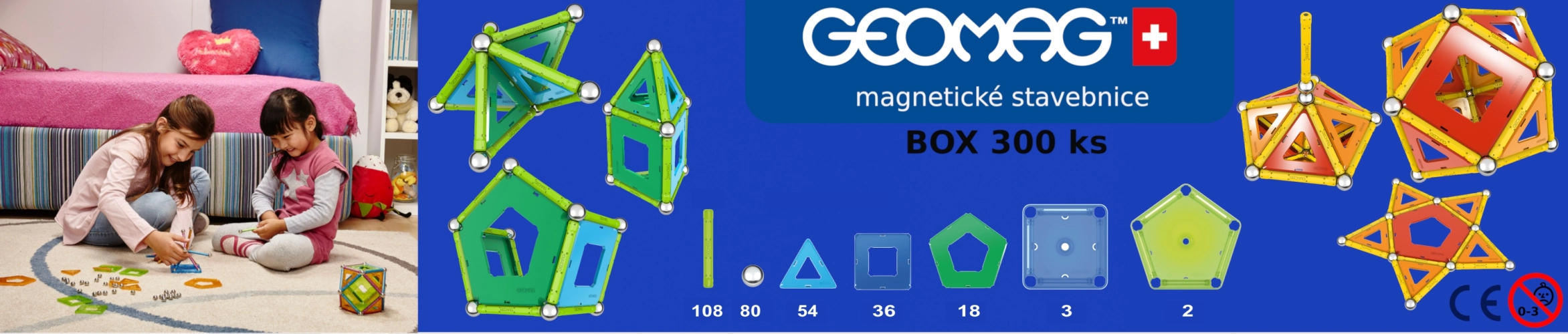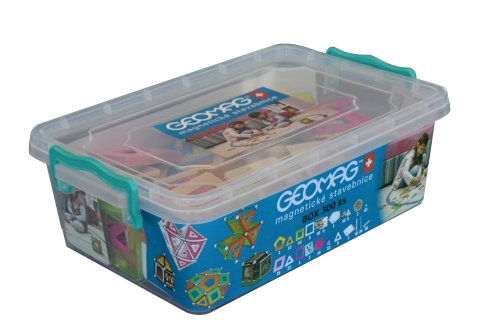 GEOMAG Box Supercolor 300 ks - je větší pestrobarevné balení stavebnice Geomag Classic panels, obsahuje 108 mag. tyček, 80 kuliček, 108 panelů (trojúhelníky, čtverce a pětiúhelníky) a 5 stavebních podložek (3x čtverec, 2x pětiúhelník). Pestrobarevná stavebnice je uložená v praktickém uzavíratelném boxu.