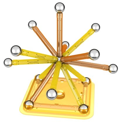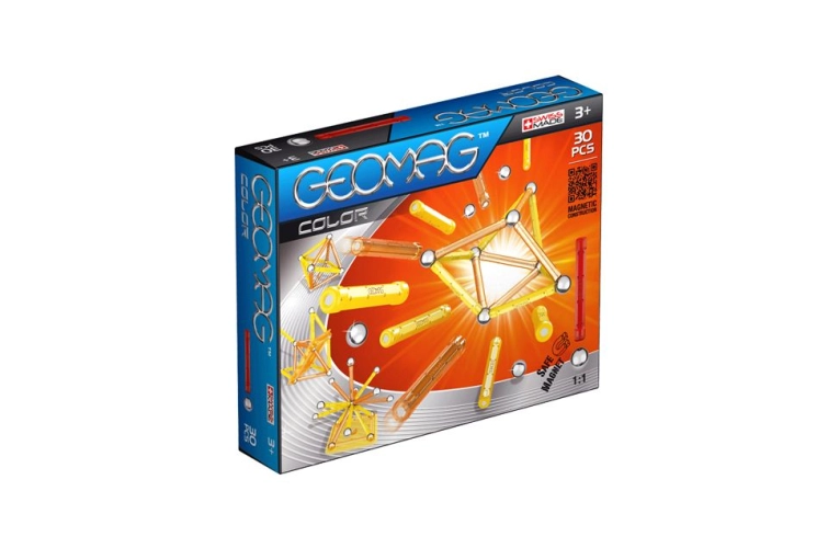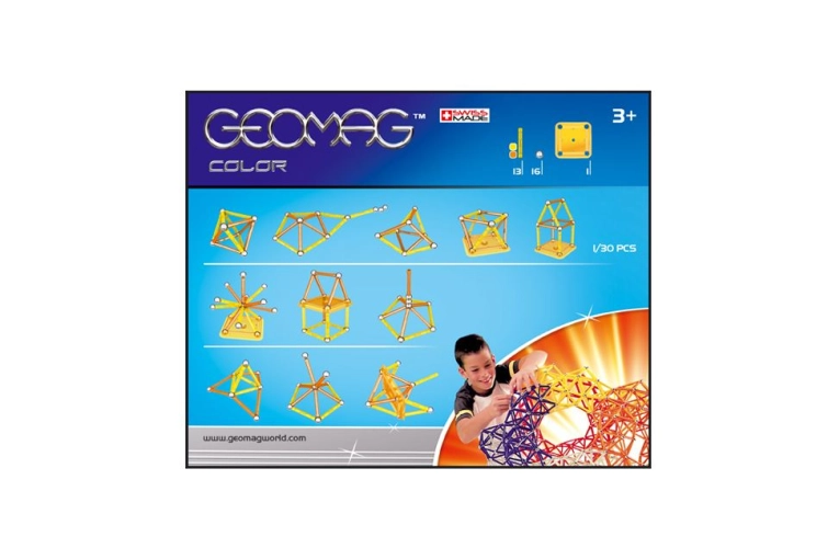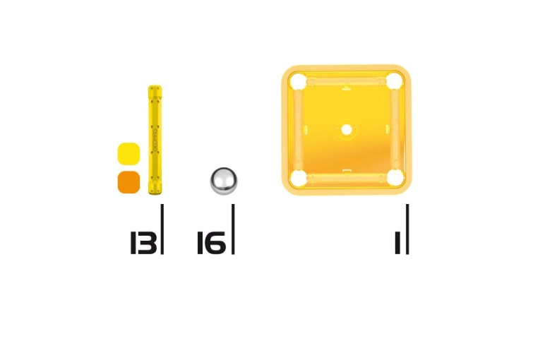 Magnetická stavebnice Geomag Kids Color 30 obsahuje 13 dlouhých magnetických tyček (6 cm), 16 ks kuliček a 1 čtvercovou stavební podložku.