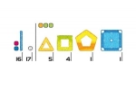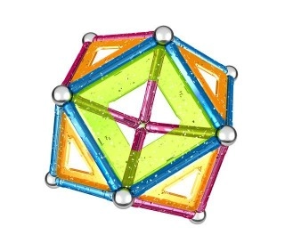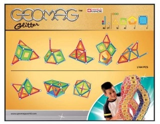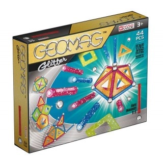 Stavebnice Geomag Glitter 44 obsahuje 16 dlouhých mg. tyčinek (6 cm) se třpytkami, 17 kuliček, 10 plastových výplní se třpytkami (čtverce, trojúhelníky, pětiúhelníky) a 1 čtvercovou stavební podložku. barva mg. tyček: modrá a červená se třpytkami barva výplní: oranžová a světle zelená se třpytkami