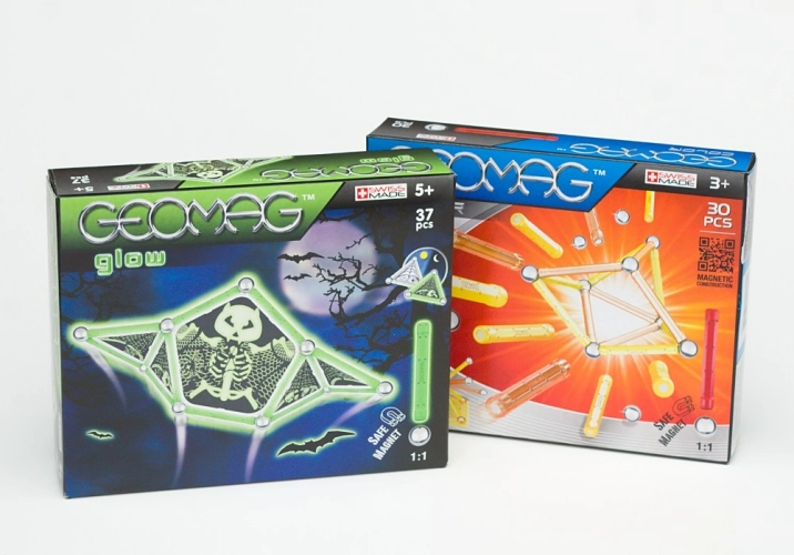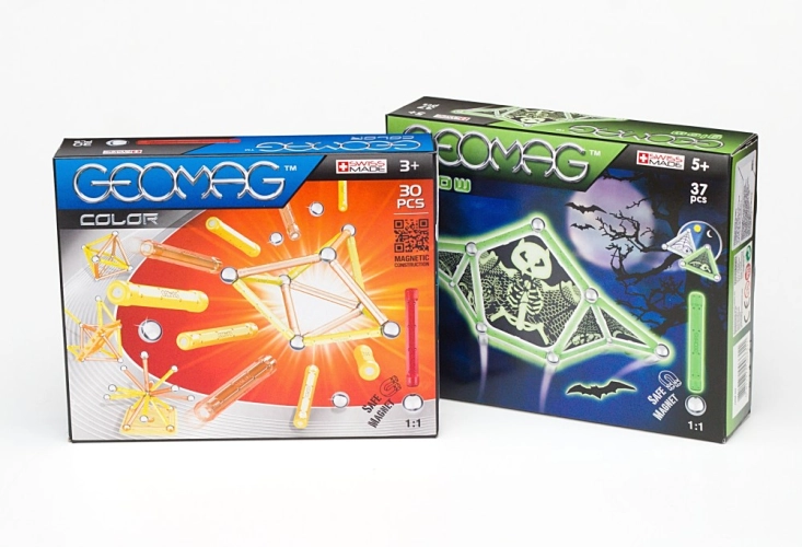 Cenově výhodná sada magnetických stavebnic Geomag Glow 37 a Geomag Color 30. Sada obsahuje celkem 67 dílů - 26 dlouhých magnetických tyček (6 cm), 26 ks kuliček, čtvercovou stavební podložku, 6 plastových výplní a fluorescenční obrázky.