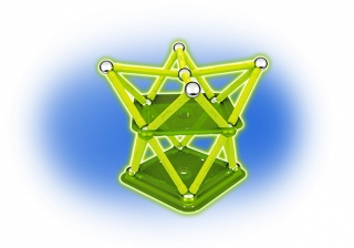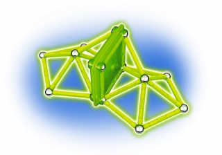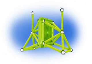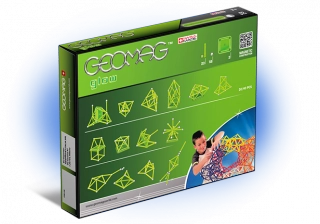 Magnetická stavebnice Geomag GLOW 40 obsahuje 20 dlouhých magnetických tyček (6 cm), 18 ocelových kuliček a 2 stavební podložky ve tvaru čtverce a pětiúhelníku.