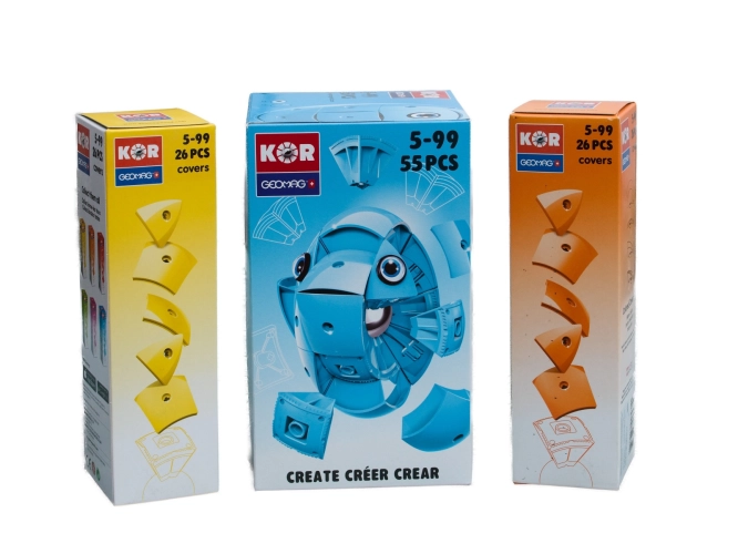 Sada Geomag Kor Egg - vajíčko modré + 2 balení kreativních krytek - žluté a oranžové. Celkem 104 dílů.