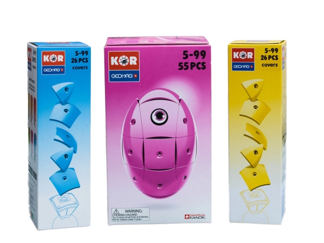 Sada Geomag Kor Egg - vajíčko růžové + 2 balení kreativních krytek - žluté a modré. Celkem 104 dílů.