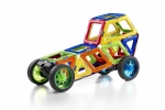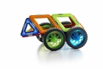Magnetická stavebnice Lunar Rover obsahuje 9 čtverců, 8 trojúhelníků, 4 kosočtverce, 2 lichoběžníky, 1 obdélník, 4 kolečka a 2 dílky pro připevnění koleček.