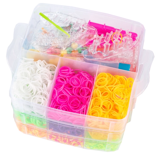 Barevné gumičky jsou umístěny ve velkém třípatrovém praktickém kufříku s přihrádkami oddělujícími barevné gumičky a doplňky v podobě přívěsků zvířátek, hvězdiček a kytiček.
