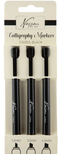 Sada kaligrafických fixů v praktickém obalu obsahuje 3 fixy s různou šířkou hrotu – 2,5 mm, 3,5 mm a 4,0 mm. Speciálně tvarovaný zkosený hrot umožňuje snadno vytvářet linky různých tlouštěk a dosáhnout tak elegantního kaligrafického písma.