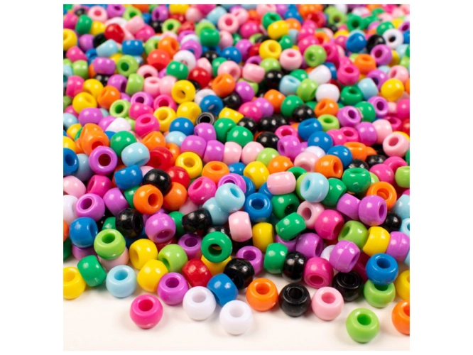 Balení obsahuje cca 1000 ks korálků o Ø 9 mm, Ø průvleku 4 mm v barvách - bílá, černá, růžová, šedá, fialová, tm. modrá, sv. modrá, žlutá, oranžová, červená.