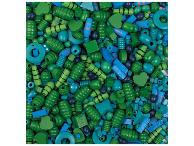 Balení obsahuje cca 1000 ks dřevěných korálků v různých tvarech v barvách - modrá, zelená o Ø 8-25 mm s Ø průvleku 2,4-4 mm.