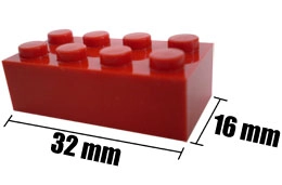 Stavební kostka Q-bricks 2x2 červené barvy. Rozměry 16 x 16 mm. Kompatibilní s kostkami klasického Lega.