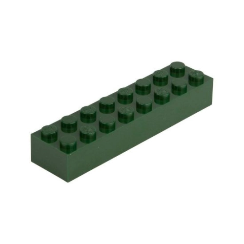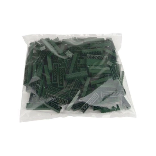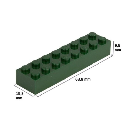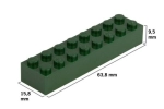 Stavební kostka Q-bricks 8x2 tmavě zelené barvy. Rozměry 64 x 16 mm. Kompatibilní s kostkami legendární dánské stavebnice.