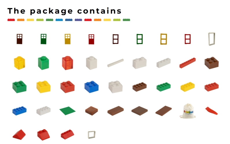 180 ks 1x1, 180 ks 1x2, 180 ks 1x4, 5 ks 1x8, 5 ks 1x12, 110 ks 2x2, 120 ks 2x2, zkosená kostka 2x4 150 ks, zkosená kostka 2x2 40 ks, roof end 2x2 20 ks, stavební podložky 20x20 4 ks, futra 1x4x6 6 ks, dveře 1x4x6 6 ks, okení rám 1x4x3 15 ks, okýnka 1x2x3 30 ks, placka 1x1 10 ks, placka 1x2 10 ks, placka 2x2 15 ks, placka 2x4 15 ks