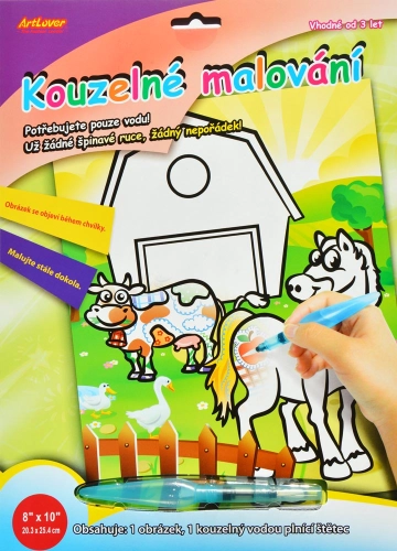 Malování vodou, magické malování, vodní omalovánky nebo také kouzelné malování je zábavná a kreativní aktivita, která je ideální pro malé děti. Místo klasických barev a štětců používáte štětec, který naplníte vodou. Štětcem malujete po obrázku se speciálním bílým povrchem. Povrch se po kontaktu s čistou vodou zbarví a objeví se krásný barevný obrázek. Až obrázek zaschne, můžete malovat znovu a stále dokola.