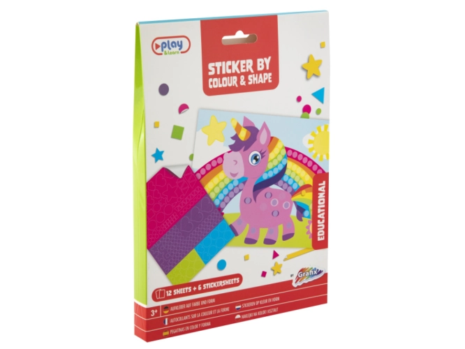 Balení obsahuje: 12 barevných obrázků, 6 listů se samolepkami různých barev a tvarů.