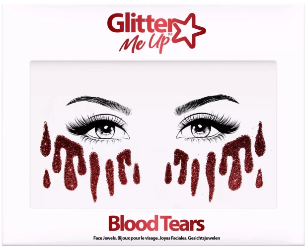 Krvavé slzy jsou samolepicí a snadno se nanášejí na obličej. Jsou vyrobeny z netoxického materiálu, jsou šetrné k pokožce a na světle se třpytí.