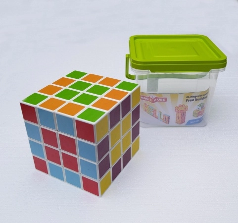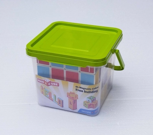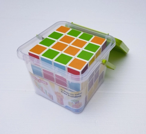 Stavebnice obsahuje celkem 64 magnetických kostek - kostky jsou různobarevné s bílými okraji. Stavebnice je uložena v praktickém kyblíku.