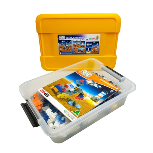 Stavebnice obsahuje stavební dílky různých tvarů a barev ke stavění plošných obrázků nebo 3D stavbiček s vesmírnými motivy podle předloh nebo podle vlastní fantazie.