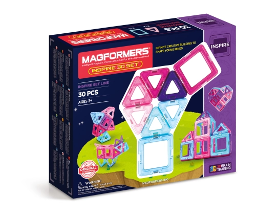 Stavebnice Magformers-30 Pastel 30 obsahuje 18 čtverců a 12 trojúhelníků v měkkých pastelových barvách a je určená především pro malé slečny. V kombinaci s poloprůhledným lesklým materiálem je velmi příjemná na pohled a kromě stavby domečků je oblíbená pro výrobu klenotů a ozdob všeho druhu. Součástí balení je brožurka s návody na stavění.