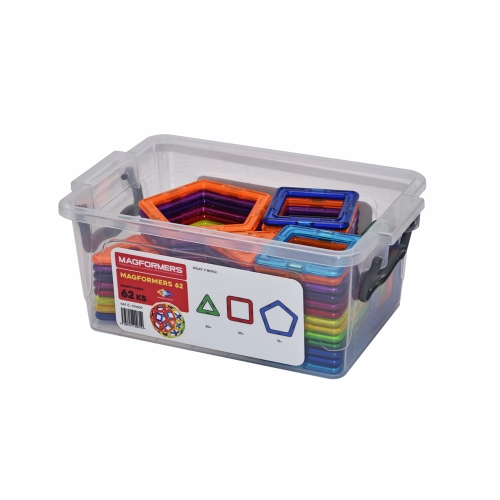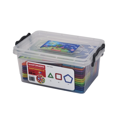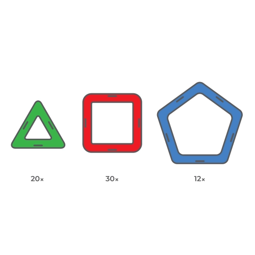 Magformers 62 obsahuje 30 čtverců, 20 trojúhelníků a 12 pětiúhelníků. Stavebnice je uložená v praktickém, uzavíratelném boxu.
