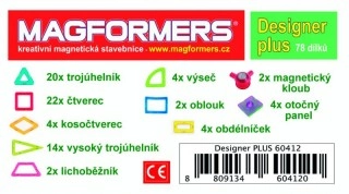 Sada Magformers Designer PLUS je o nové dílky rozšířená verze oblíbeného "Designer boxu", která dovoluje využívat zaoblené tvary a válcové plochy stejně jako přidávat volně spřažené části, které lze díky dvěma magnetickým kloubům vůči sobě libovolně natáčet. Sada obsahuje 78 dílků, podrobnosti v dalších informacích dole.
