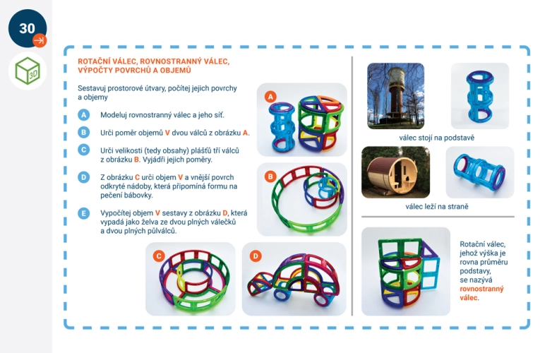 Součástí boxu je sada výukových karet s metodickými pokyny pro děti i rodiče (soubor 33 karet s úkoly). Některé karty jsou oboustranné, kdy na rubové straně najdete obsáhlejší řešení vč. názorných obrázků. K většině úkolů najdete řešení na posledních 2 kartách. Projekt je opět realizován ve spolupráci s akreditovanou lektorkou vzdělávání učitelů, RNDr. Marií Kupčákovou, Ph.D. Výukové karty 2D a 3D geometrie je materiál určený pro přímou podporu učitelů ZŠ nebo rodičů. Jejich obsah koresponduje se současnými požadavky kladenými na žáky českých škol na konci 7. a 9. ročníku ZŠ.