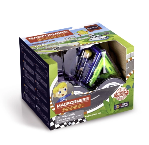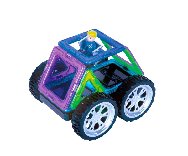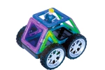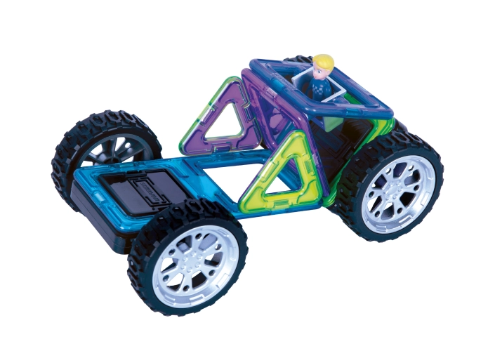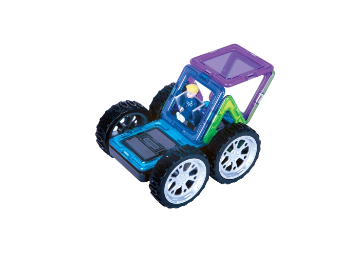 Magformers Motokára obsahuje celkem 8 dílků: 2 trojúhelníky, 2 čtverce, 1 obdélník, 1 otočná figurka, 2 podvozky s kolečky.