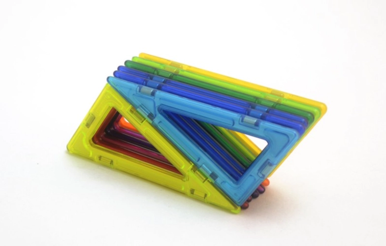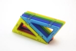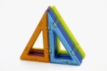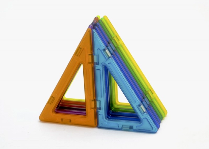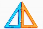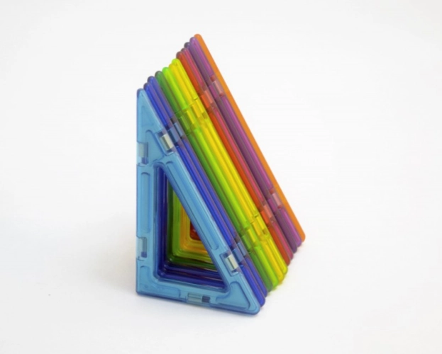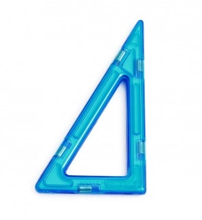 Sada 12 ks Pravoúhlých trojúhelníků Magformers v různých barvách. Kratší odvěsna odpovídá délce strany klasického čtverce Magformers 6,5 cm, delší odvěsna je dvojnásobně dlouhá 13 cm.